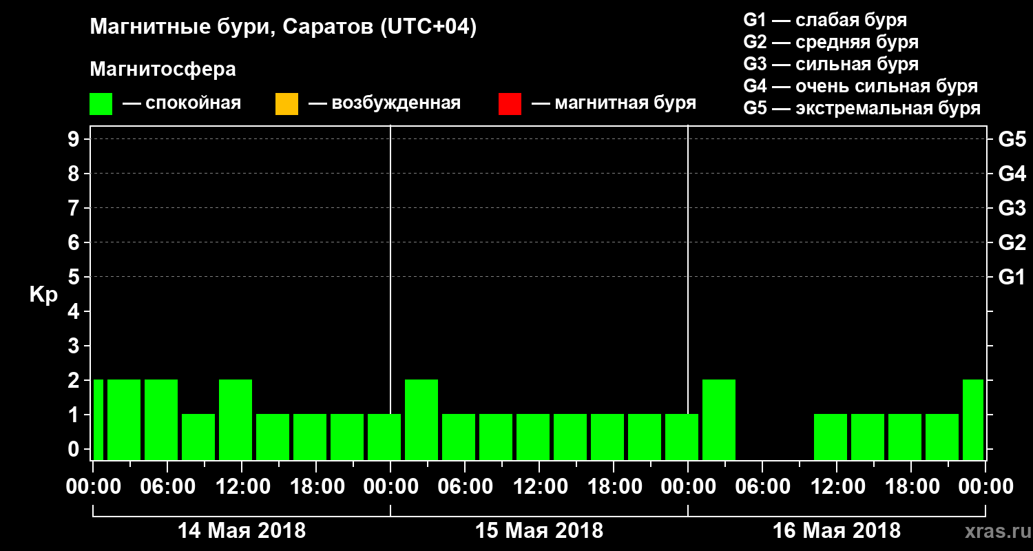 Изменения геомагнитного индекса Kp с 14 по 16 мая 2018 года для средних широт