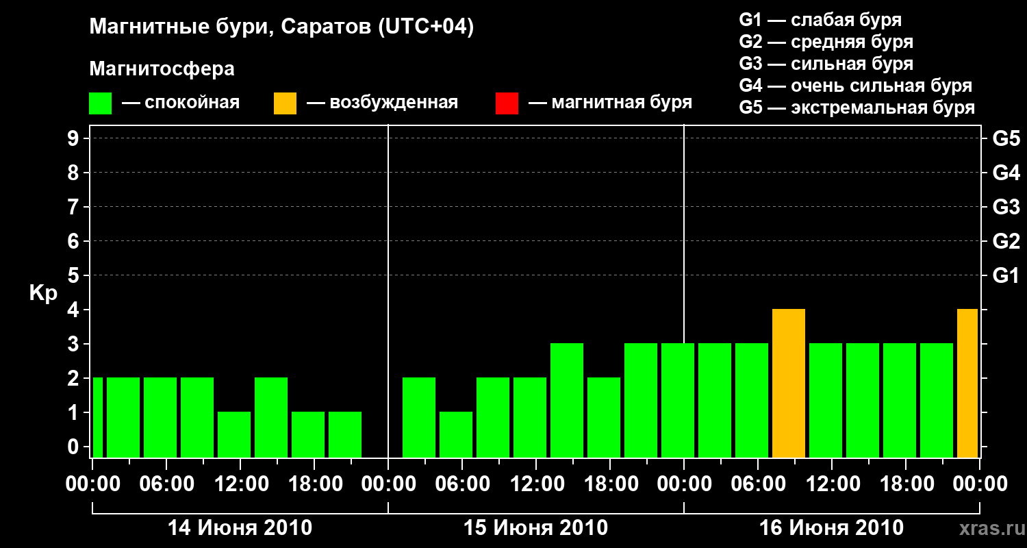Изменения геомагнитного индекса Kp с 14 по 16 июня 2010 года для средних широт