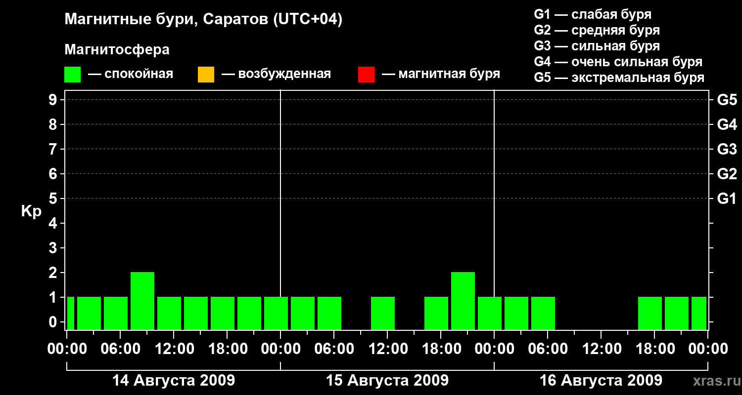 Изменения геомагнитного индекса Kp с 14 по 16 августа 2009 года для средних широт