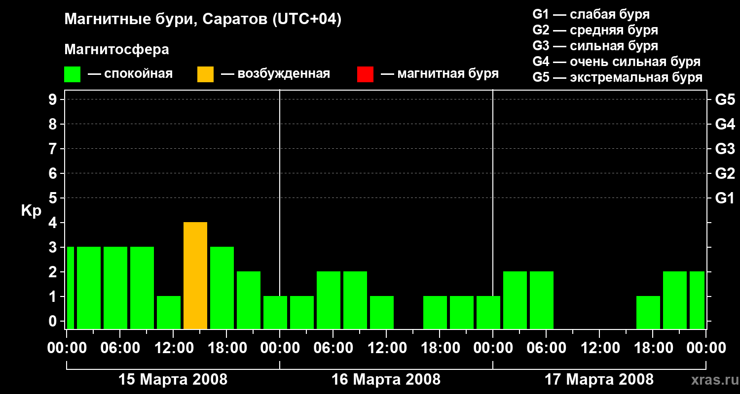 Изменения геомагнитного индекса Kp с 15 по 17 марта 2008 года для средних широт