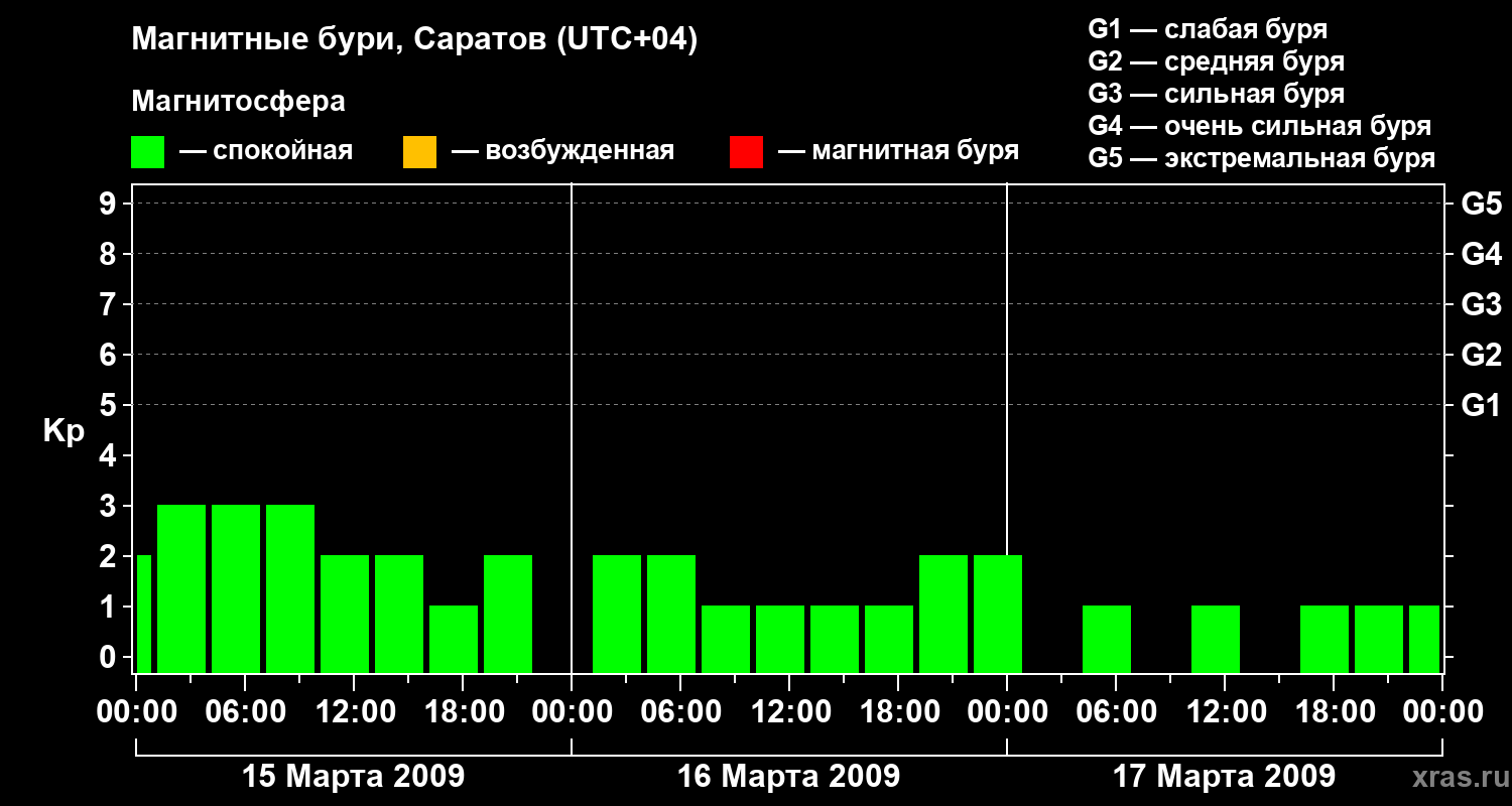 Изменения геомагнитного индекса Kp с 15 по 17 марта 2009 года для средних широт