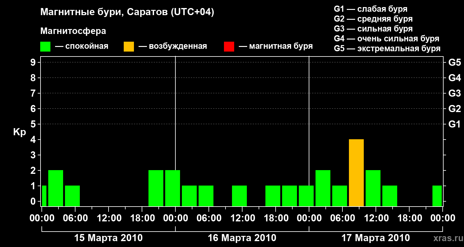 Изменения геомагнитного индекса Kp с 15 по 17 марта 2010 года для средних широт