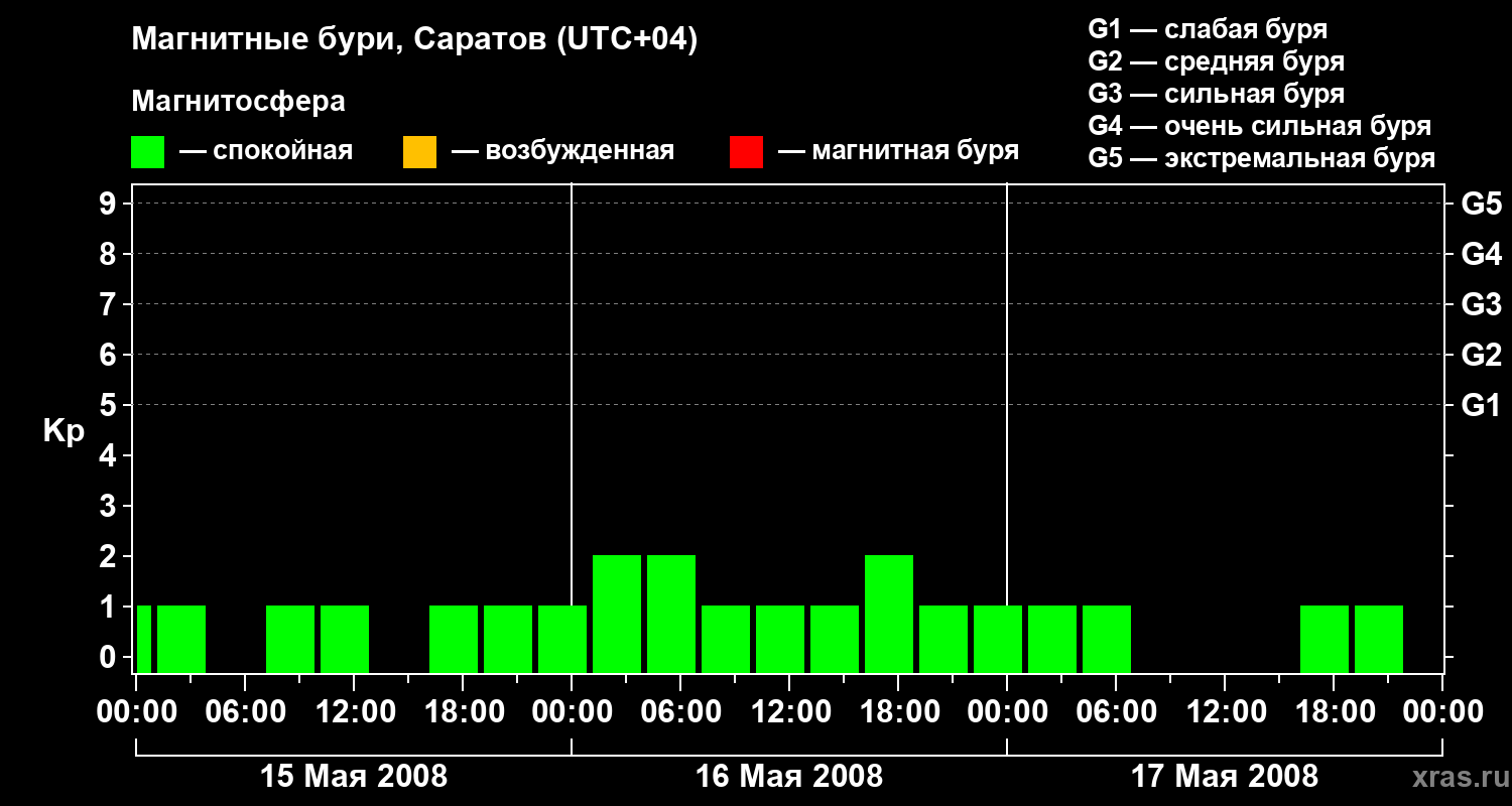 Изменения геомагнитного индекса Kp с 15 по 17 мая 2008 года для средних широт