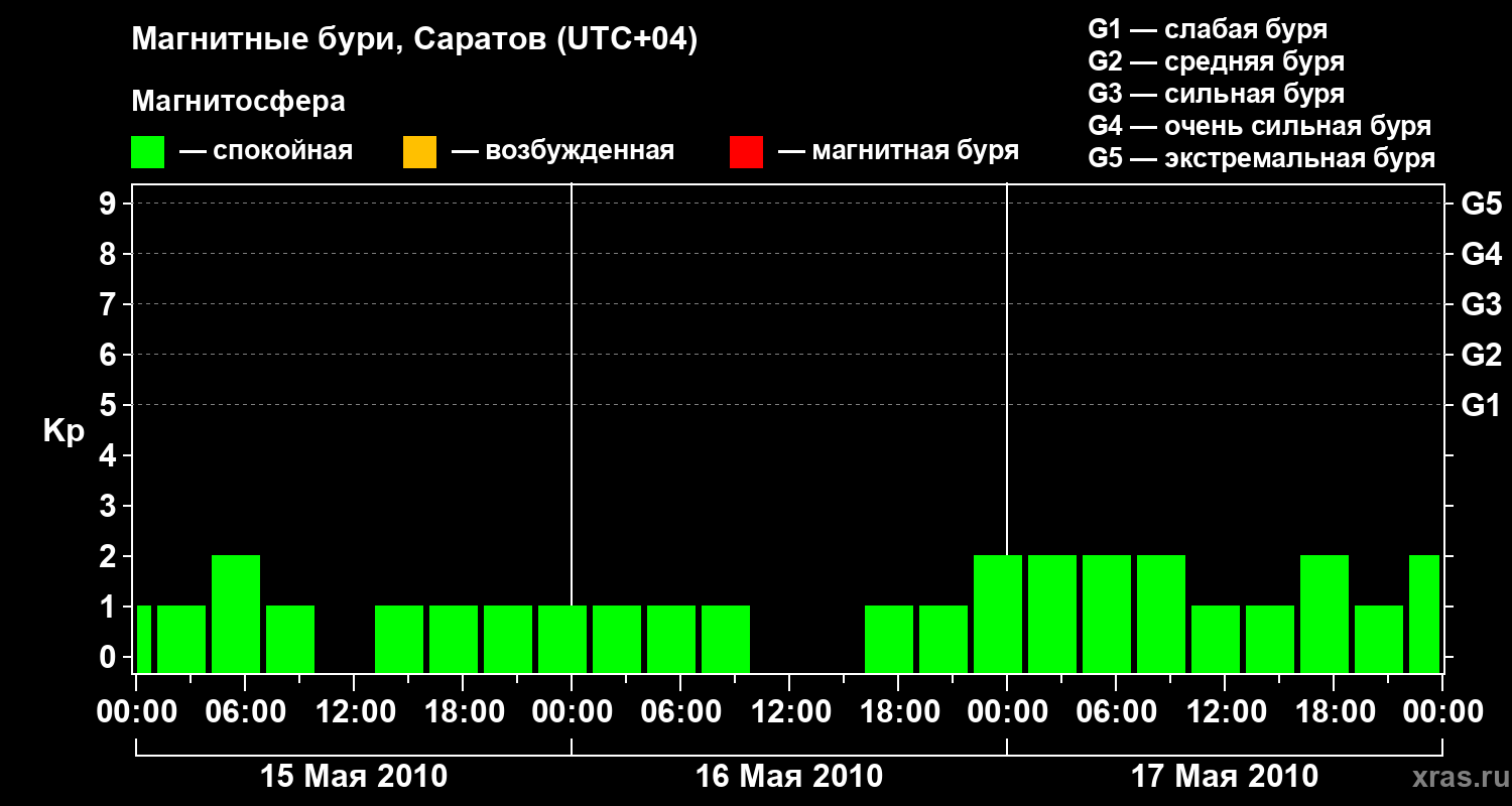 Изменения геомагнитного индекса Kp с 15 по 17 мая 2010 года для средних широт