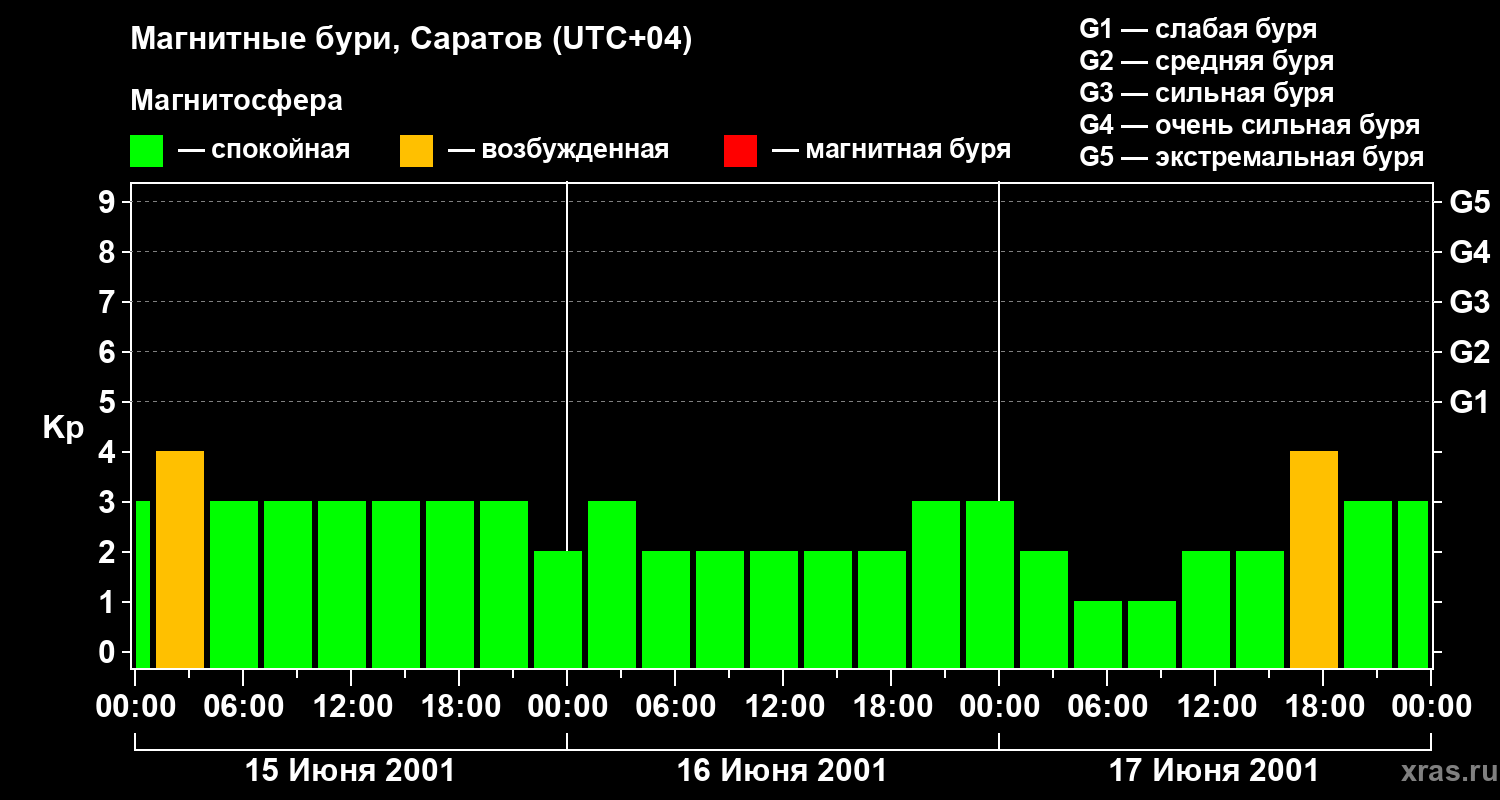 Изменения геомагнитного индекса Kp с 15 по 17 июня 2001 года для средних широт