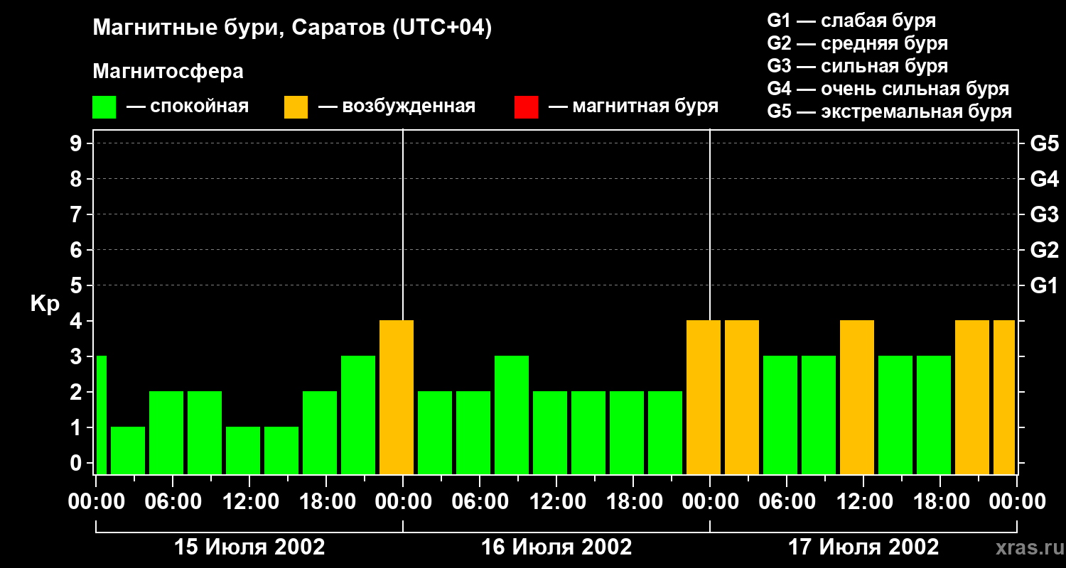 Изменения геомагнитного индекса Kp с 15 по 17 июля 2002 года для средних широт