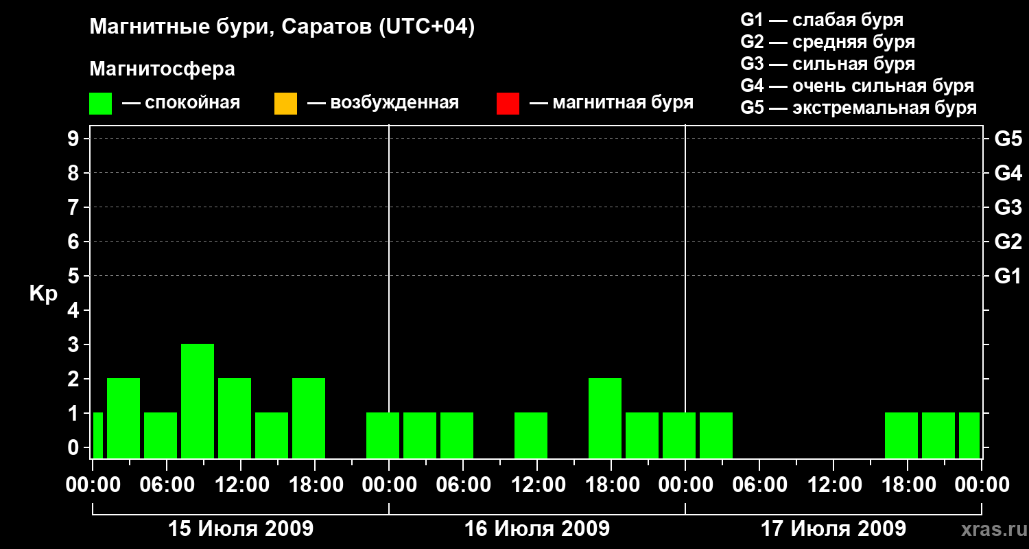 Изменения геомагнитного индекса Kp с 15 по 17 июля 2009 года для средних широт