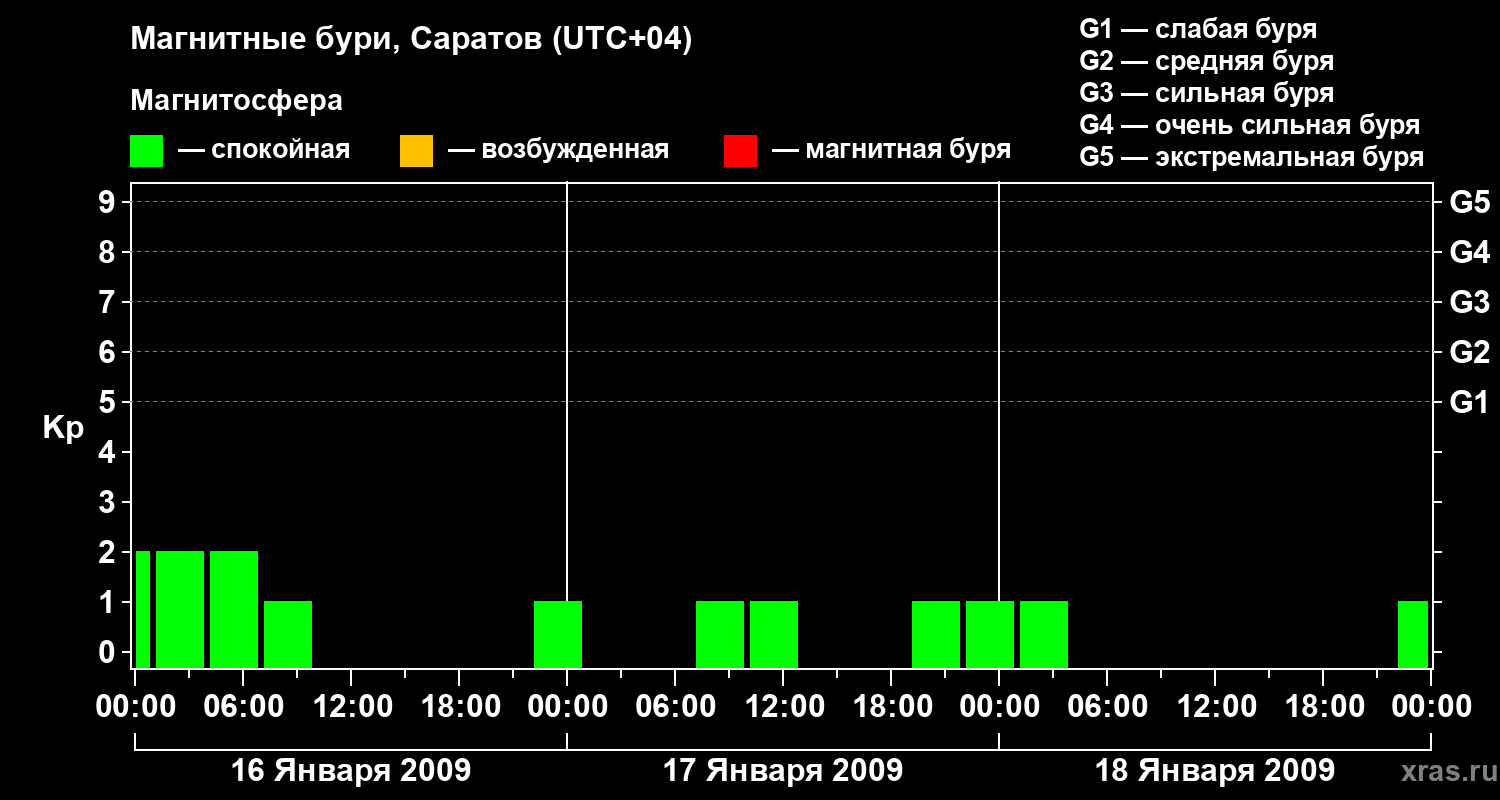 Изменения геомагнитного индекса Kp с 16 по 18 января 2009 года для средних широт
