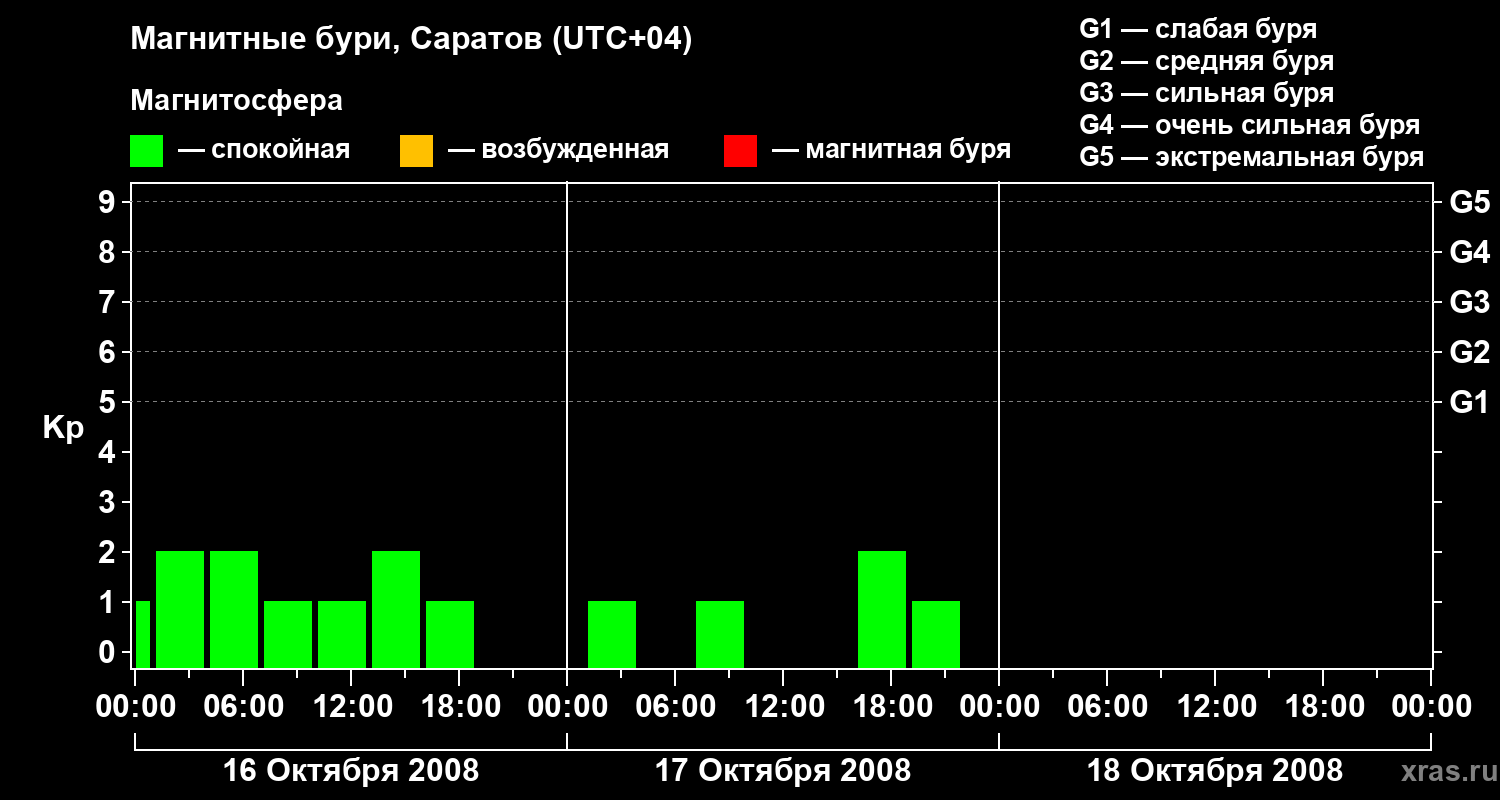 Изменения геомагнитного индекса Kp с 16 по 18 октября 2008 года для средних широт