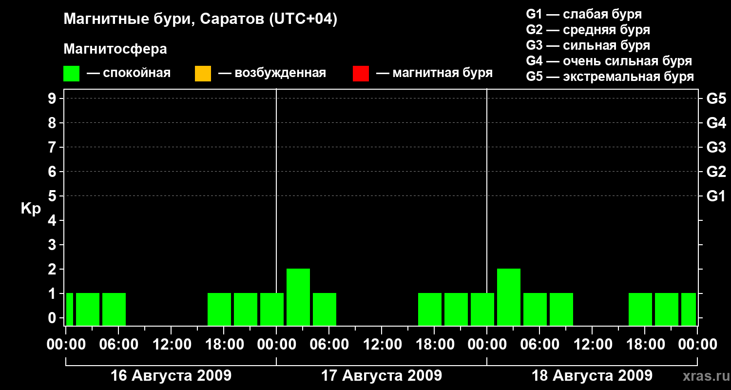 Изменения геомагнитного индекса Kp с 16 по 18 августа 2009 года для средних широт