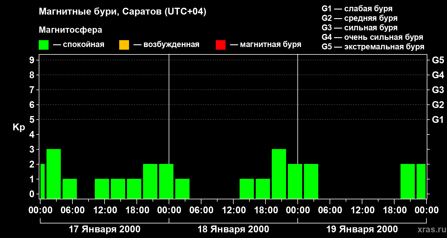 Изменения геомагнитного индекса Kp с 17 по 19 января 2000 года для средних широт