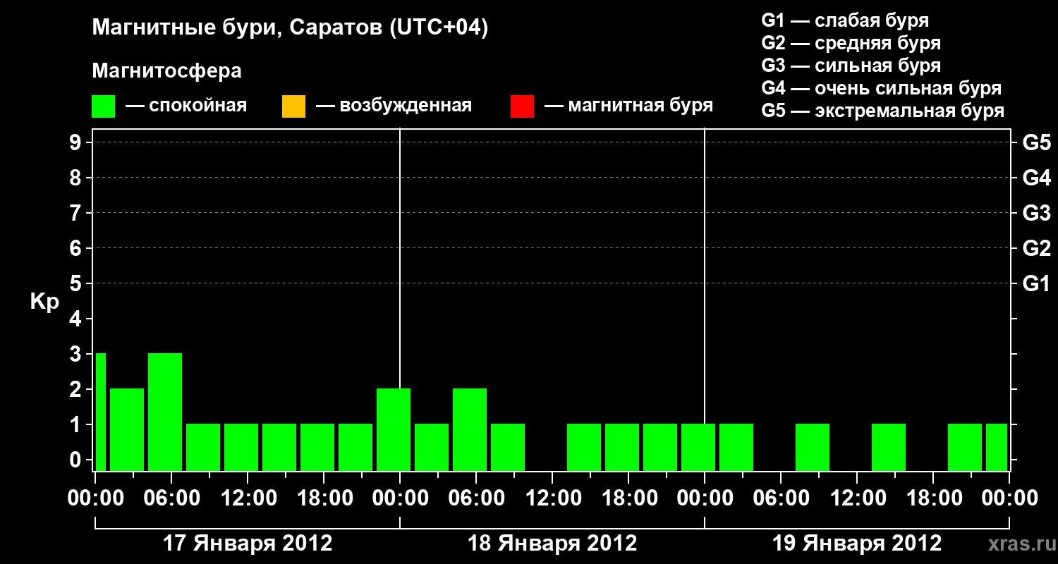 Изменения геомагнитного индекса Kp с 17 по 19 января 2012 года для средних широт