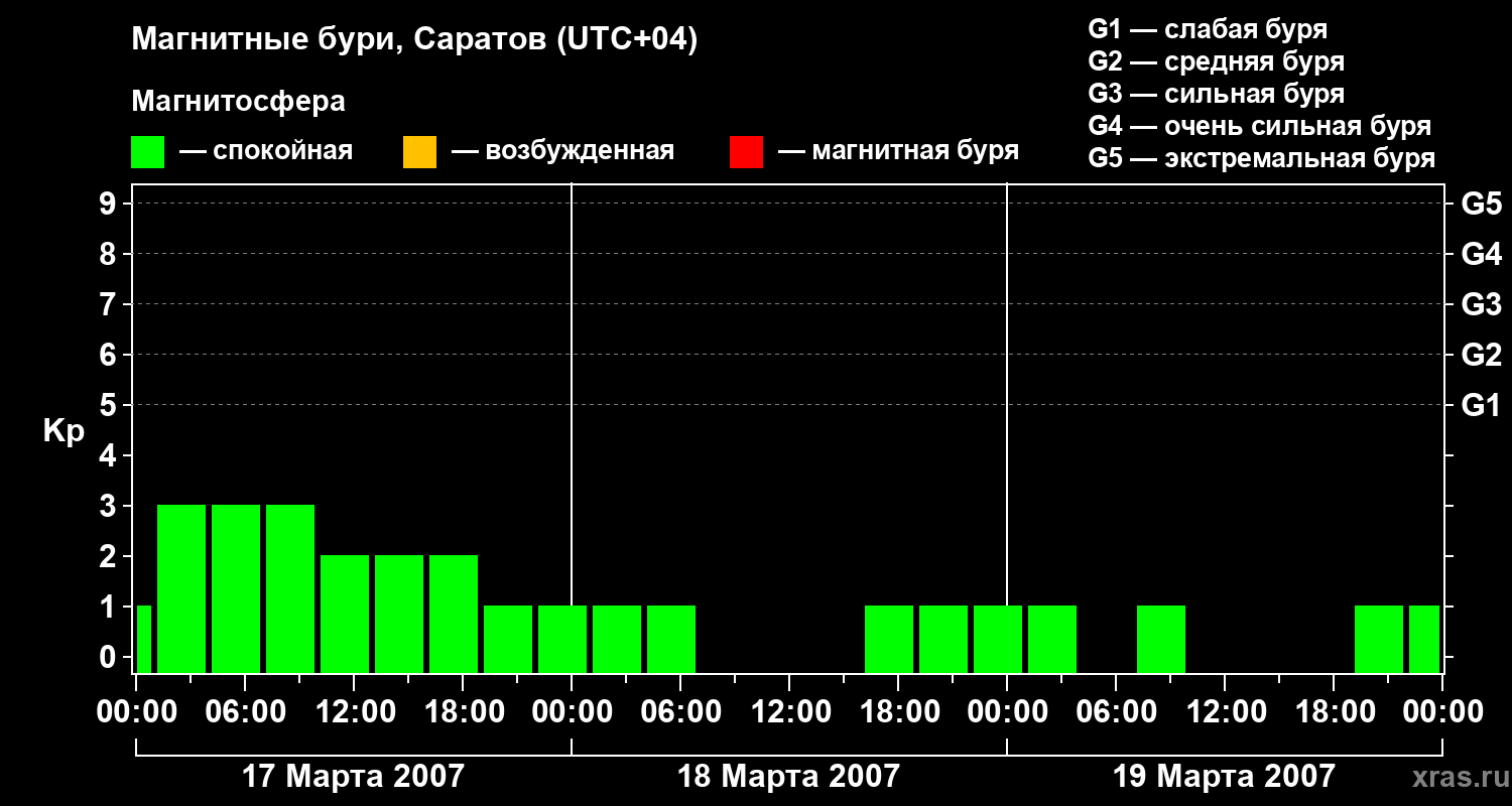 Изменения геомагнитного индекса Kp с 17 по 19 марта 2007 года для средних широт