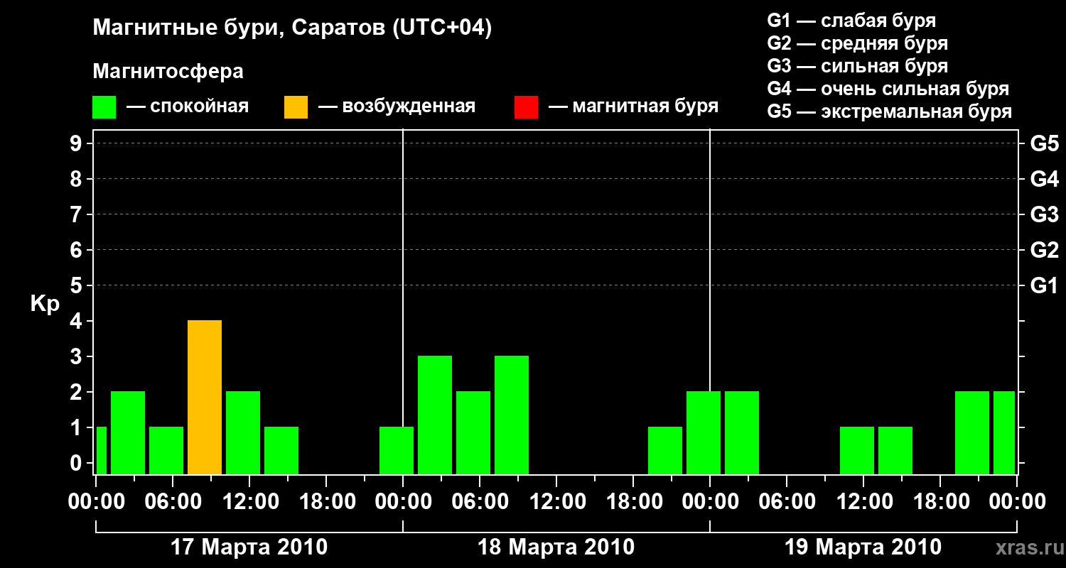 Изменения геомагнитного индекса Kp с 17 по 19 марта 2010 года для средних широт