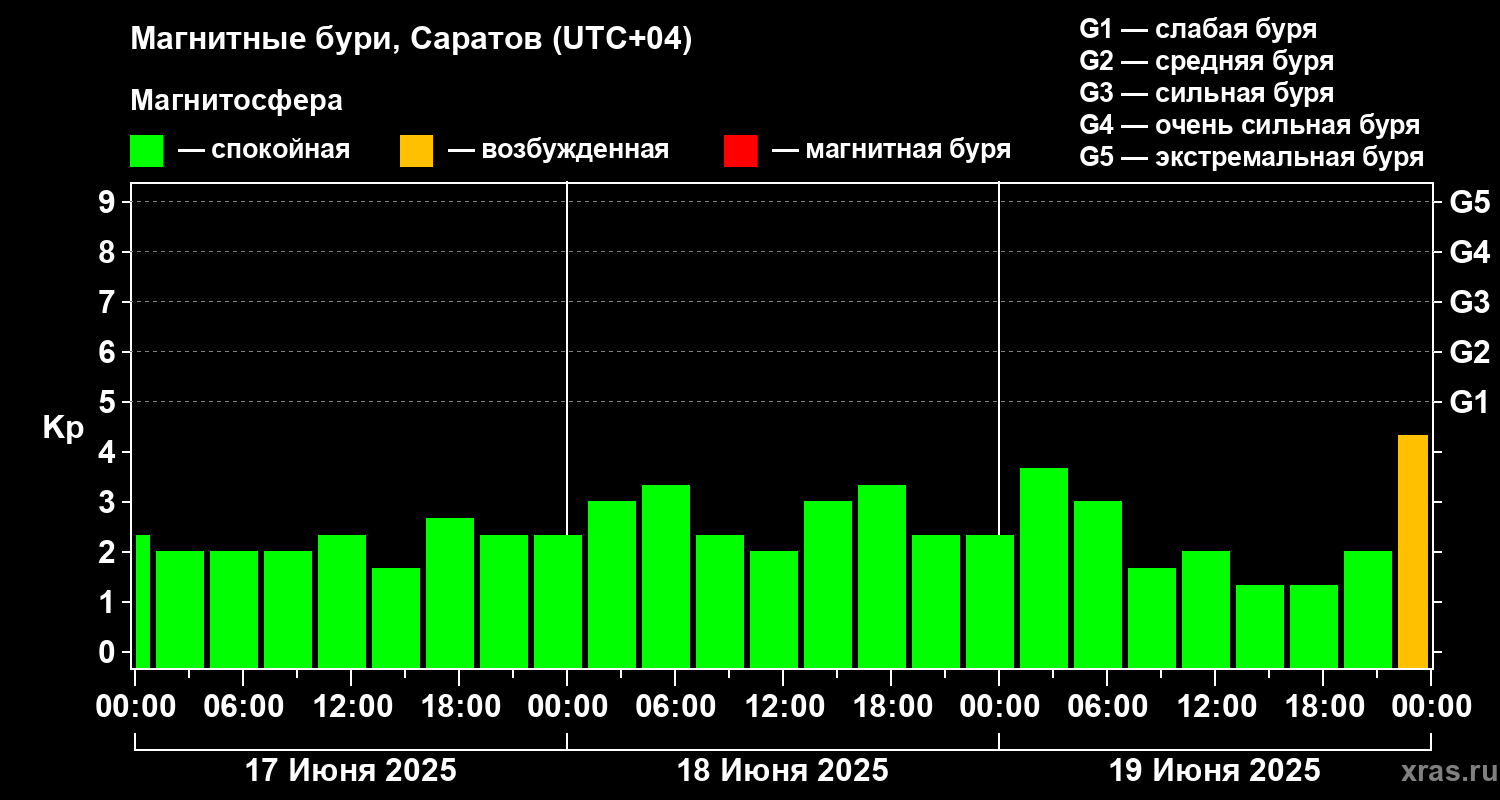 Изменения геомагнитного индекса Kp с 17 по 19 июня 2025 года для средних широт