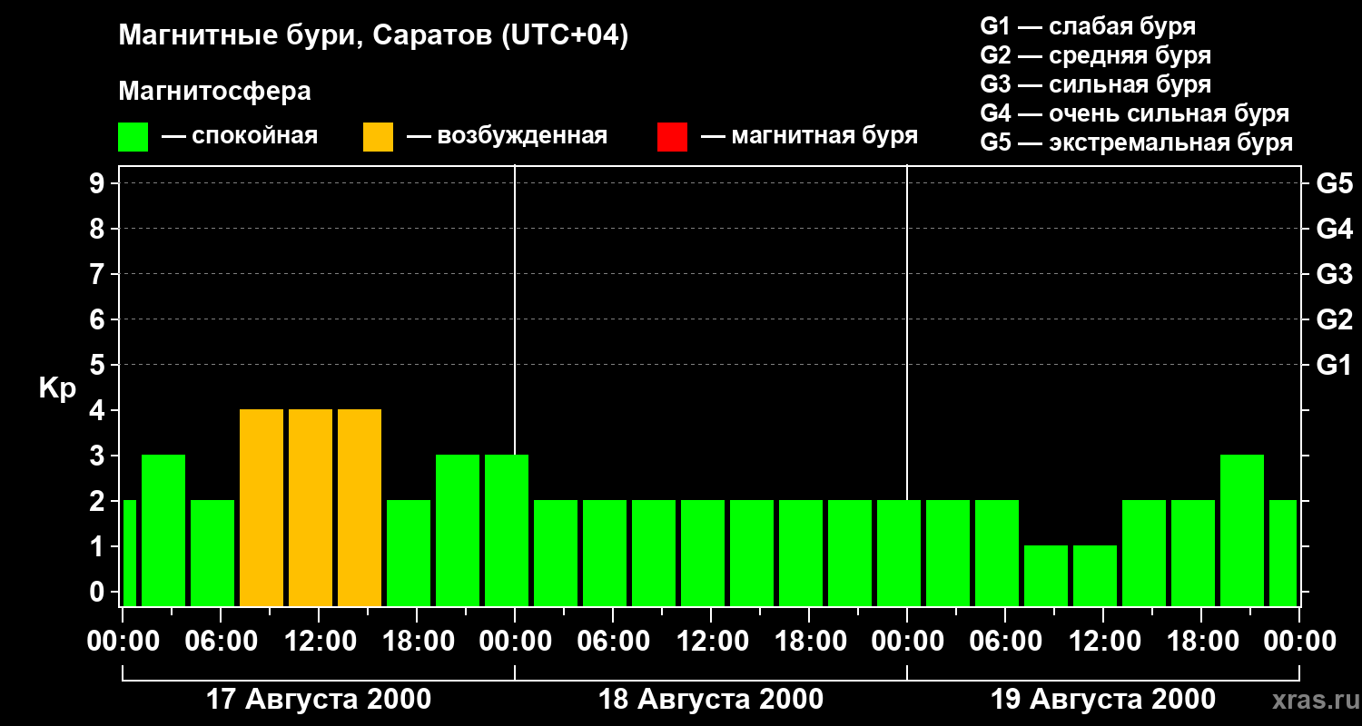 Изменения геомагнитного индекса Kp с 17 по 19 августа 2000 года для средних широт