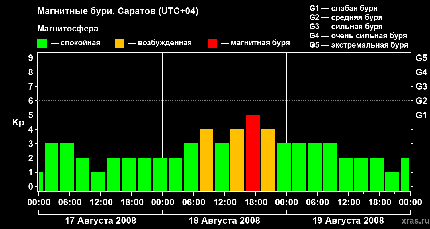 Изменения геомагнитного индекса Kp с 17 по 19 августа 2008 года для средних широт