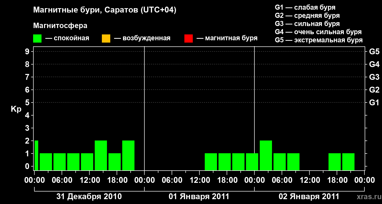 Изменения геомагнитного индекса Kp с 31 декабря 2010 года по 2 января 2011 года для средних широт