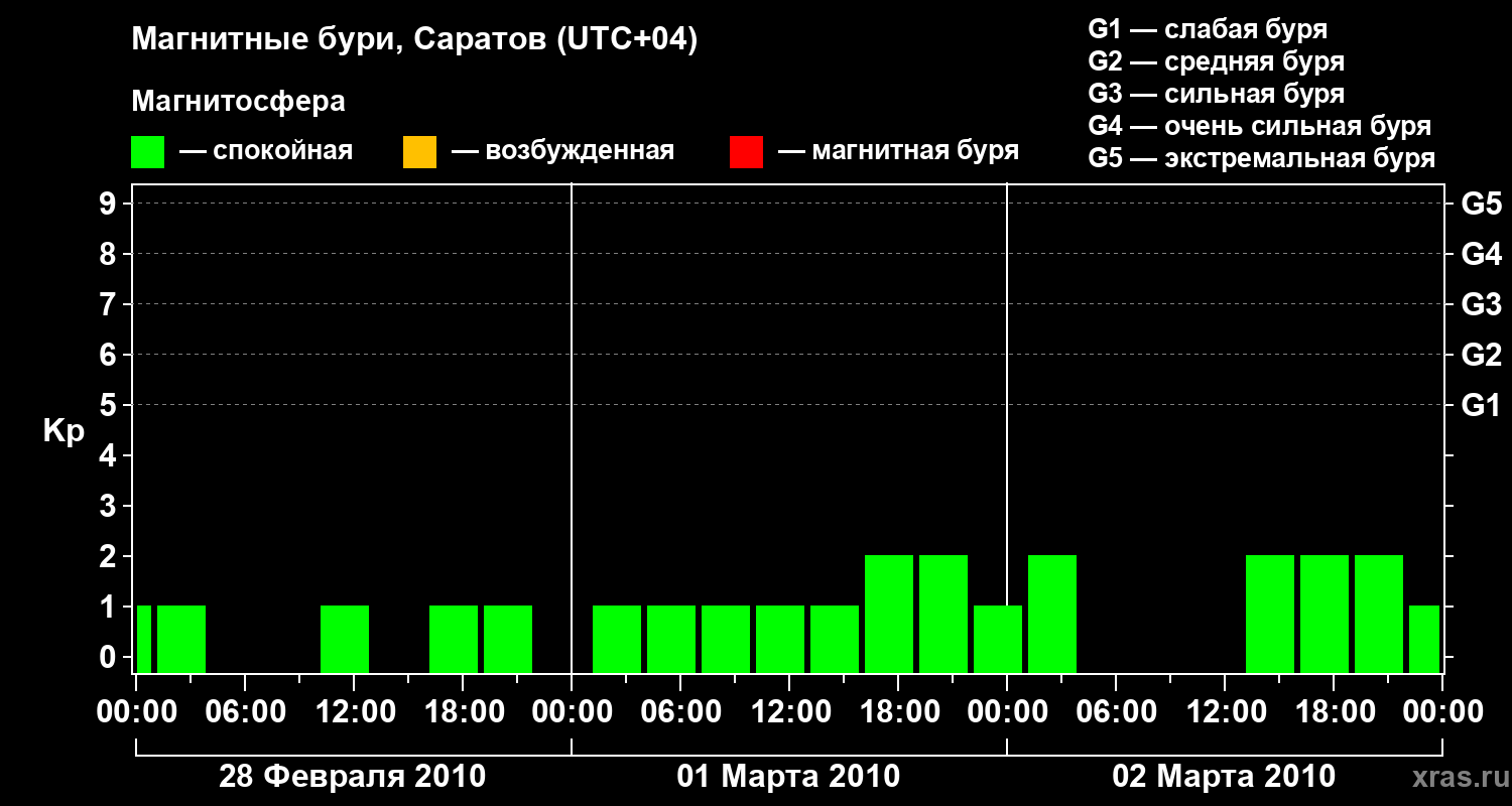 Изменения геомагнитного индекса Kp с 28 февраля по 2 марта 2010 года для средних широт