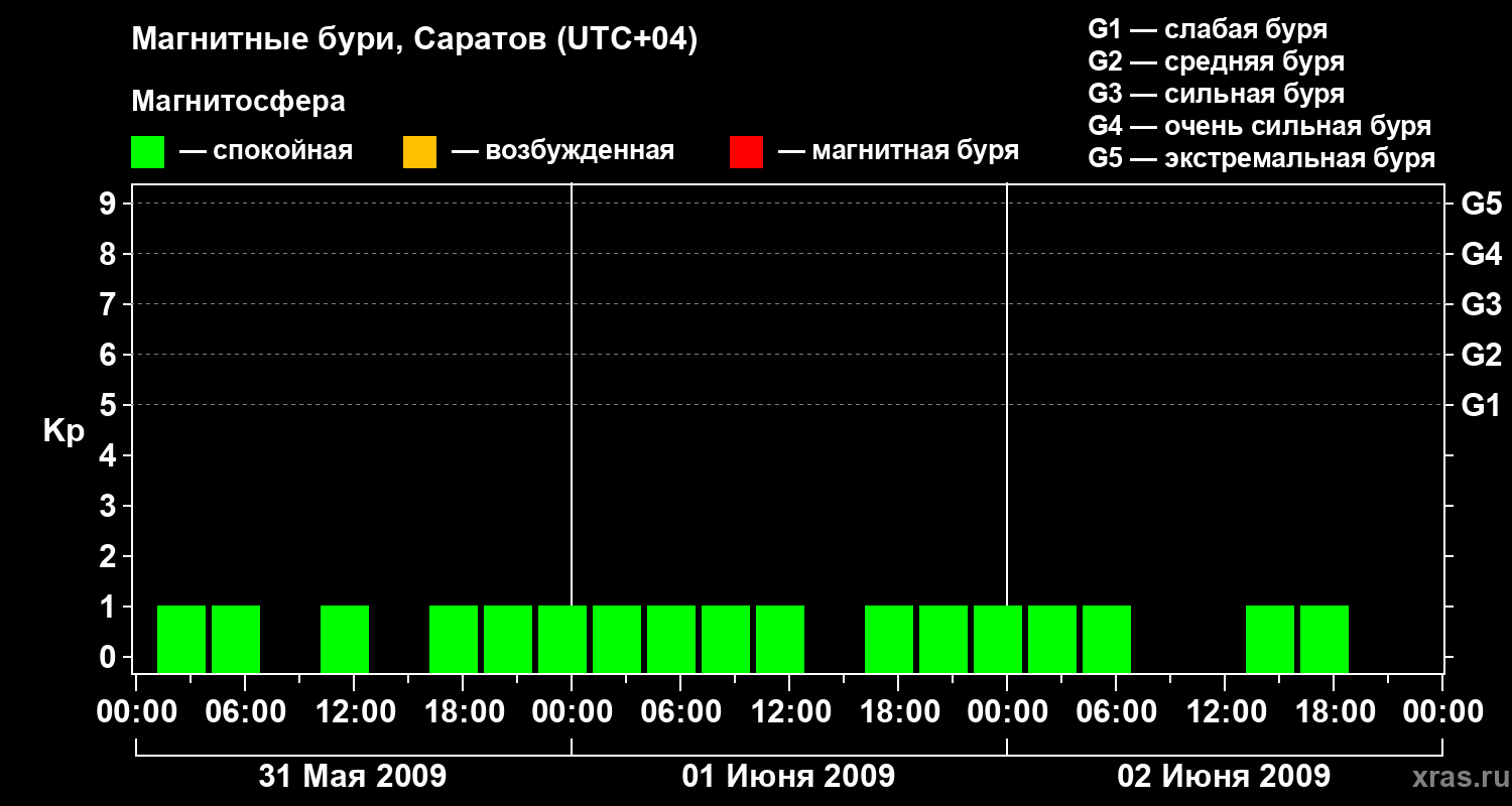 Изменения геомагнитного индекса Kp с 31 мая по 2 июня 2009 года для средних широт