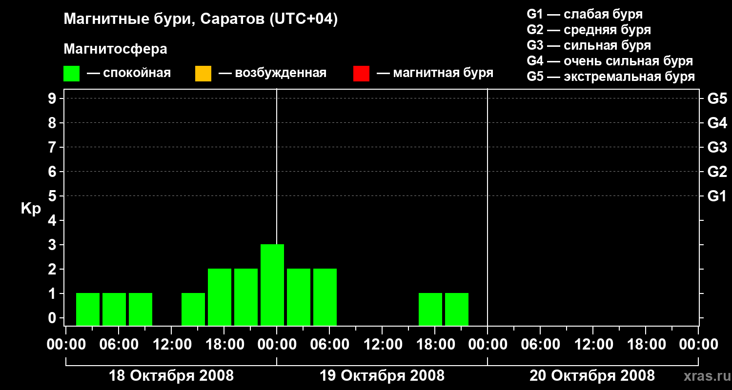 Изменения геомагнитного индекса Kp с 18 по 20 октября 2008 года для средних широт