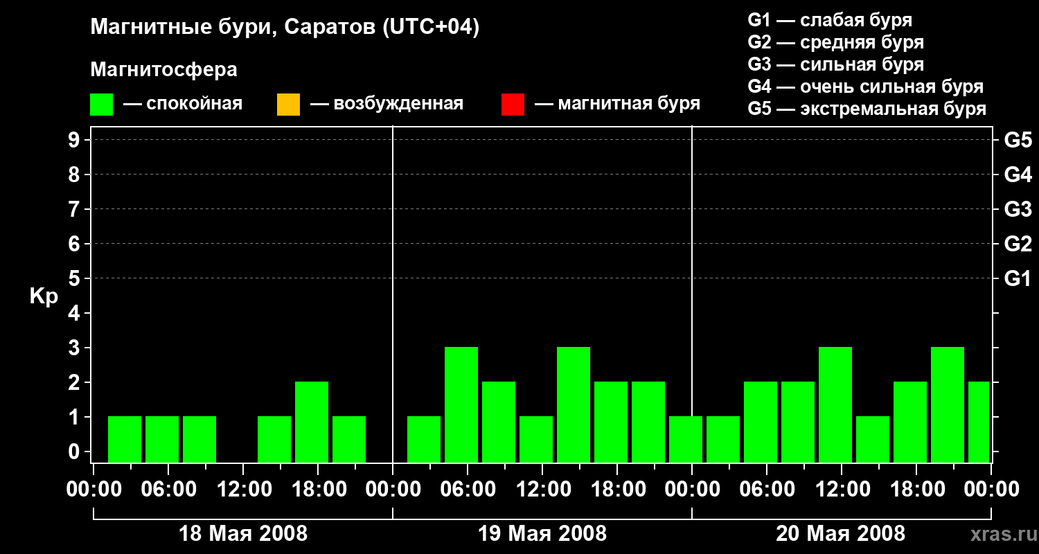 Изменения геомагнитного индекса Kp с 18 по 20 мая 2008 года для средних широт
