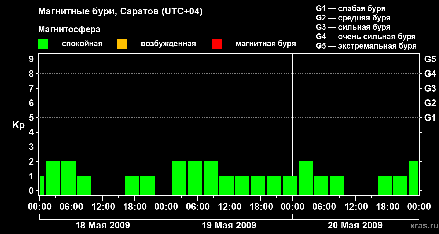 Изменения геомагнитного индекса Kp с 18 по 20 мая 2009 года для средних широт