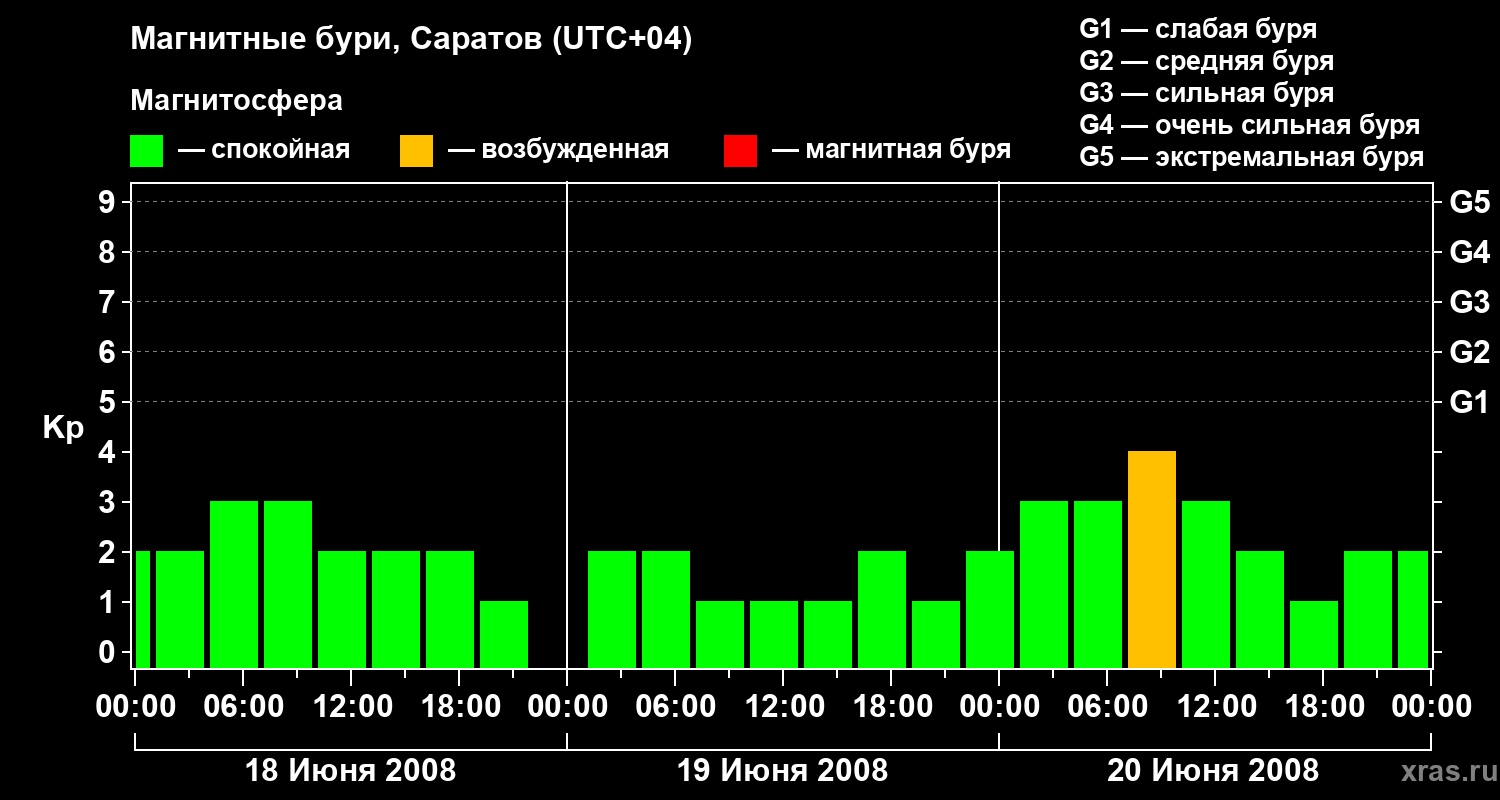 Изменения геомагнитного индекса Kp с 18 по 20 июня 2008 года для средних широт