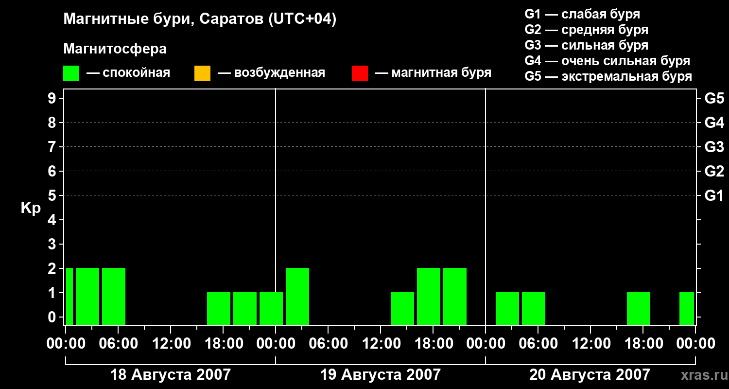 Изменения геомагнитного индекса Kp с 18 по 20 августа 2007 года для средних широт