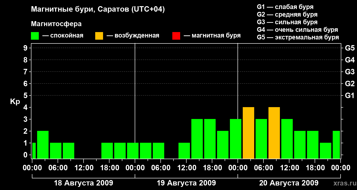 Изменения геомагнитного индекса Kp с 18 по 20 августа 2009 года для средних широт