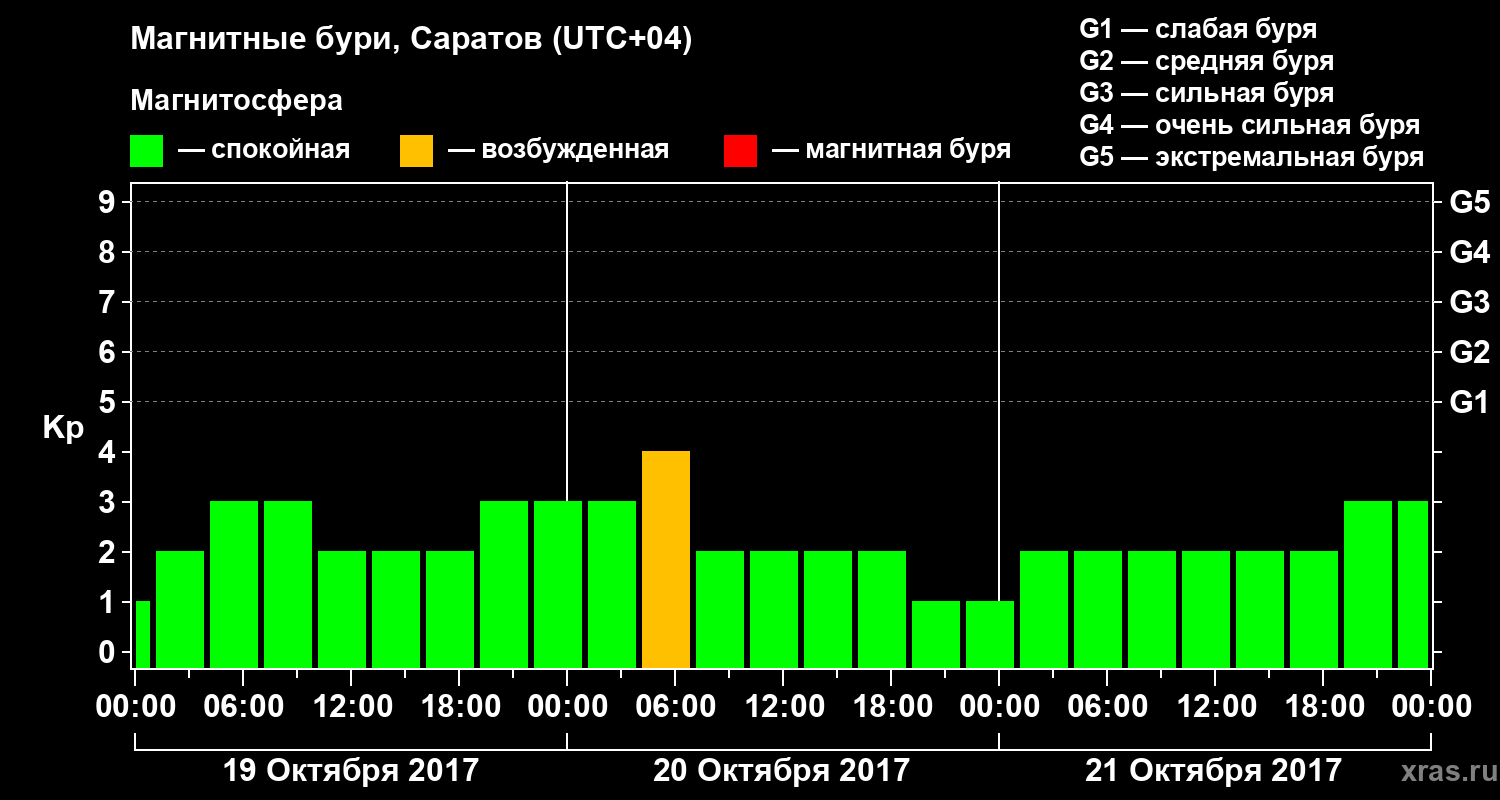 Изменения геомагнитного индекса Kp с 19 по 21 октября 2017 года для средних широт