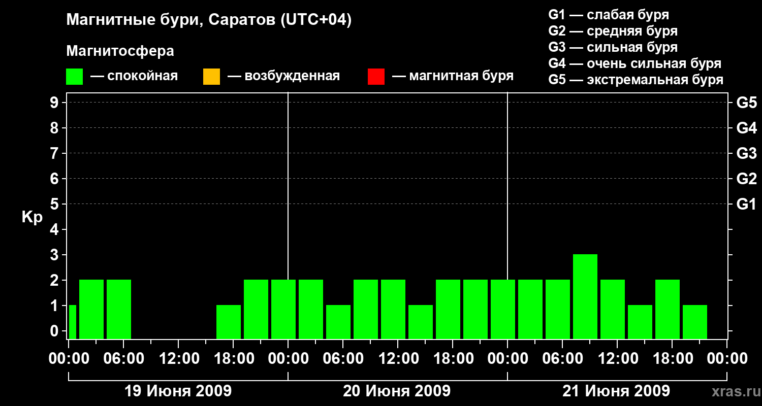 Изменения геомагнитного индекса Kp с 19 по 21 июня 2009 года для средних широт