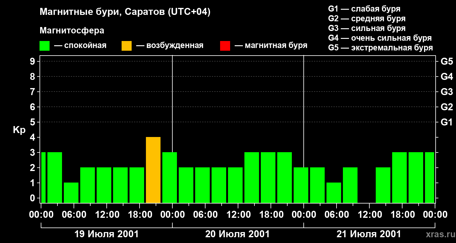 Изменения геомагнитного индекса Kp с 19 по 21 июля 2001 года для средних широт