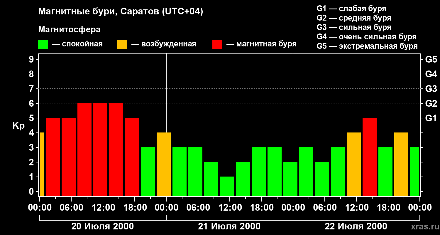 Изменения геомагнитного индекса Kp с 20 по 22 июля 2000 года для средних широт