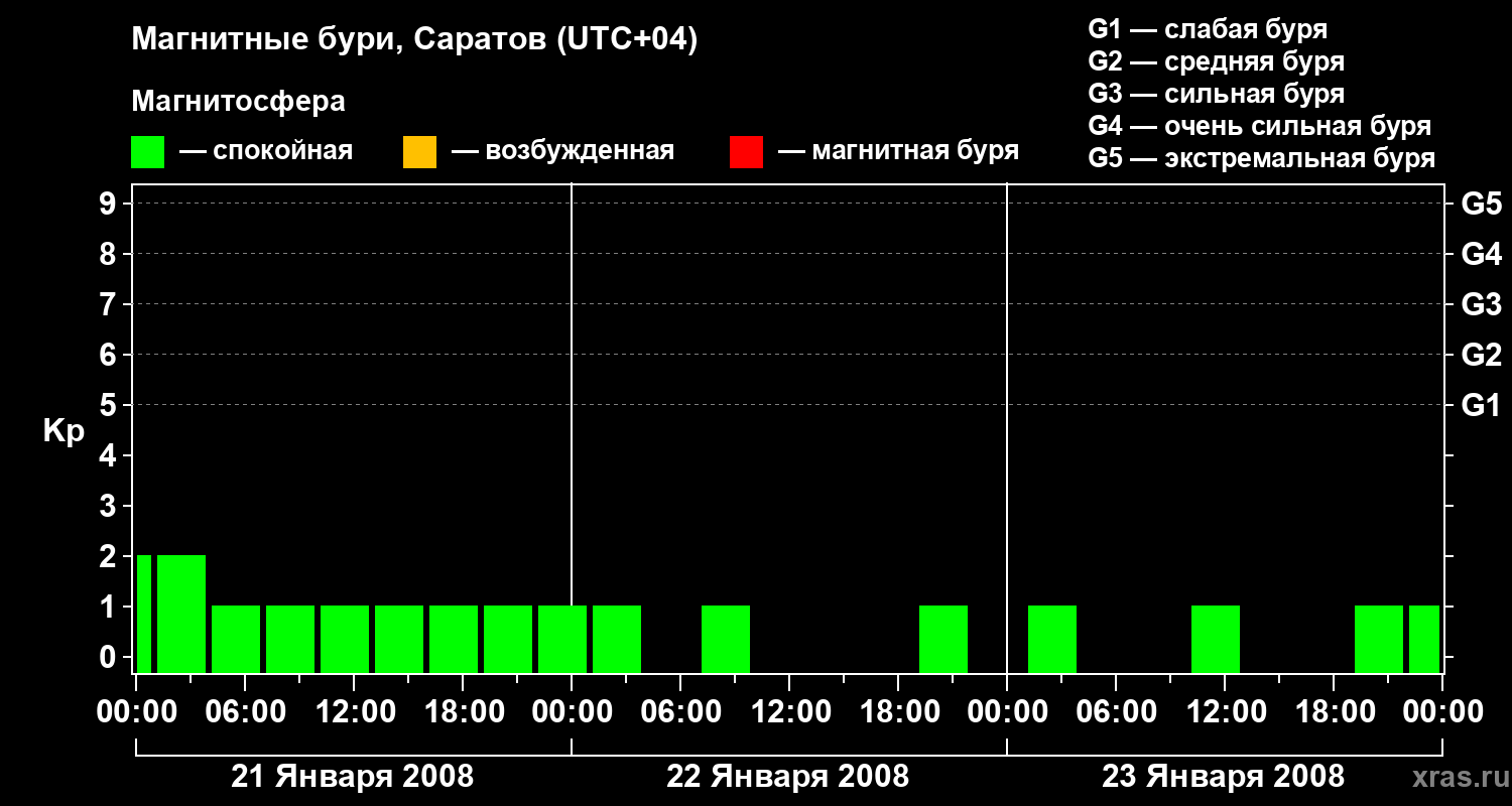 Изменения геомагнитного индекса Kp с 21 по 23 января 2008 года для средних широт