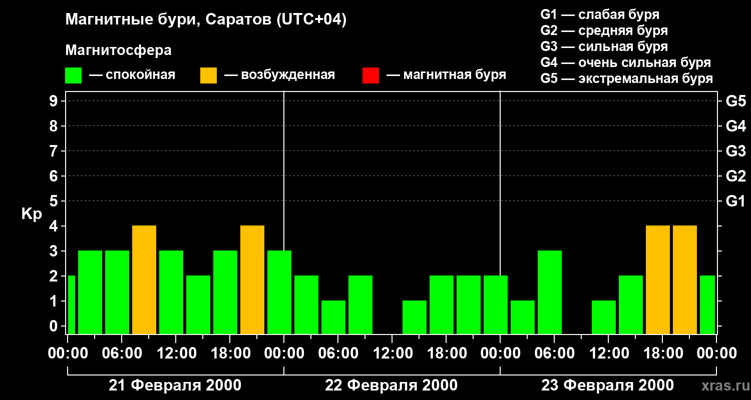 Изменения геомагнитного индекса Kp с 21 по 23 февраля 2000 года для средних широт