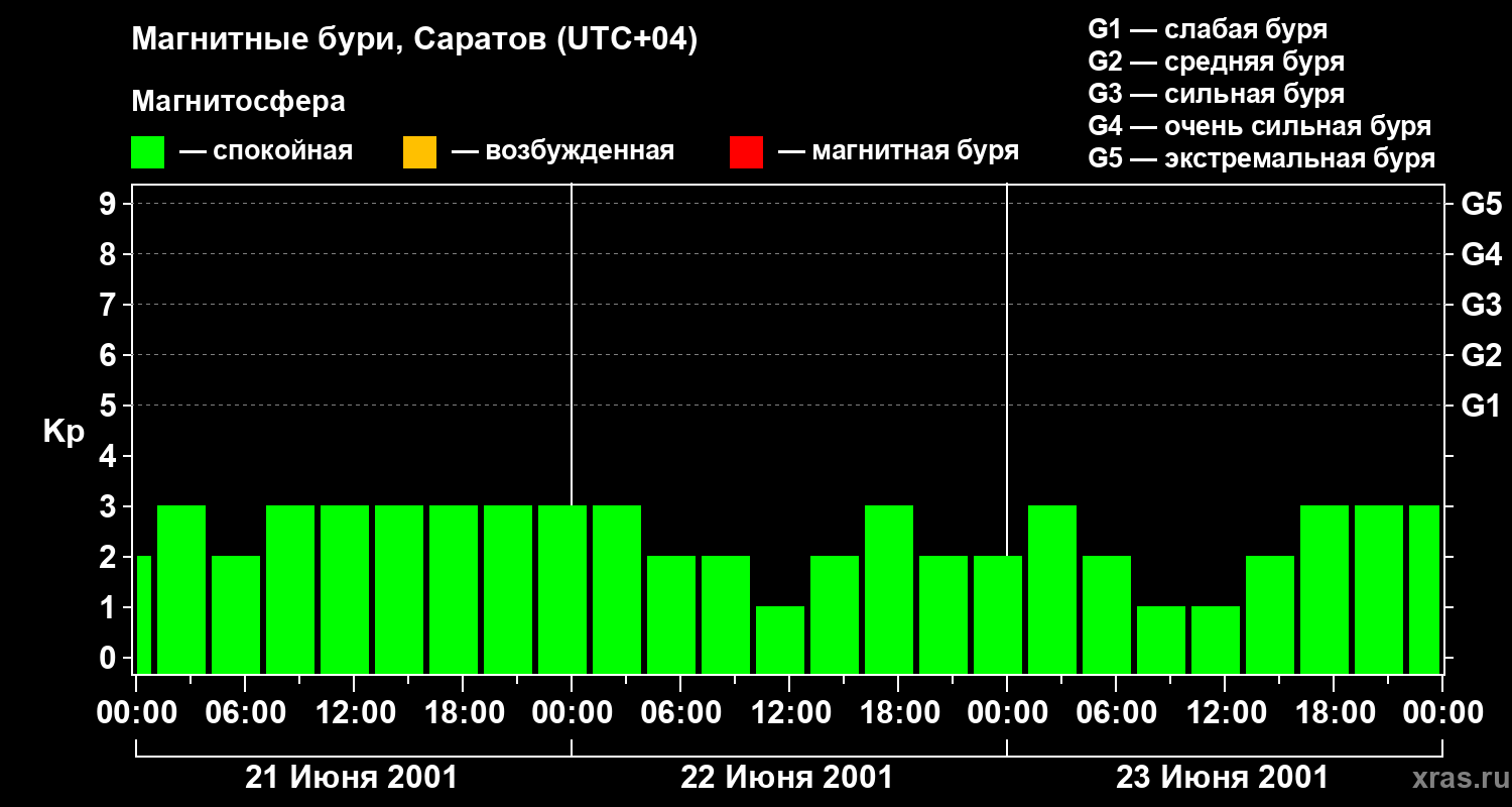 Изменения геомагнитного индекса Kp с 21 по 23 июня 2001 года для средних широт