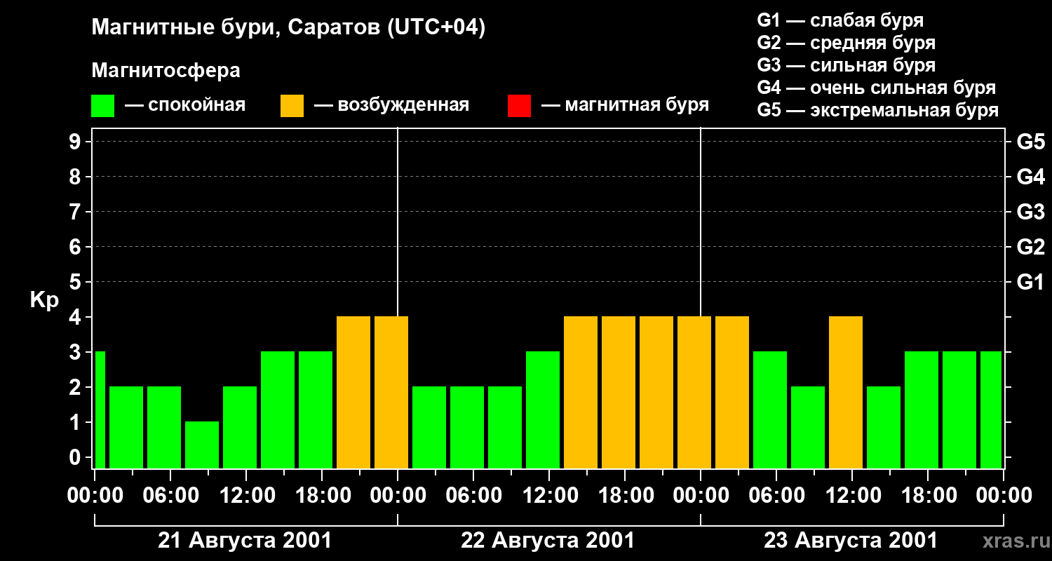 Изменения геомагнитного индекса Kp с 21 по 23 августа 2001 года для средних широт