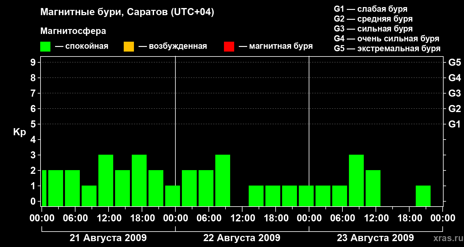 Изменения геомагнитного индекса Kp с 21 по 23 августа 2009 года для средних широт