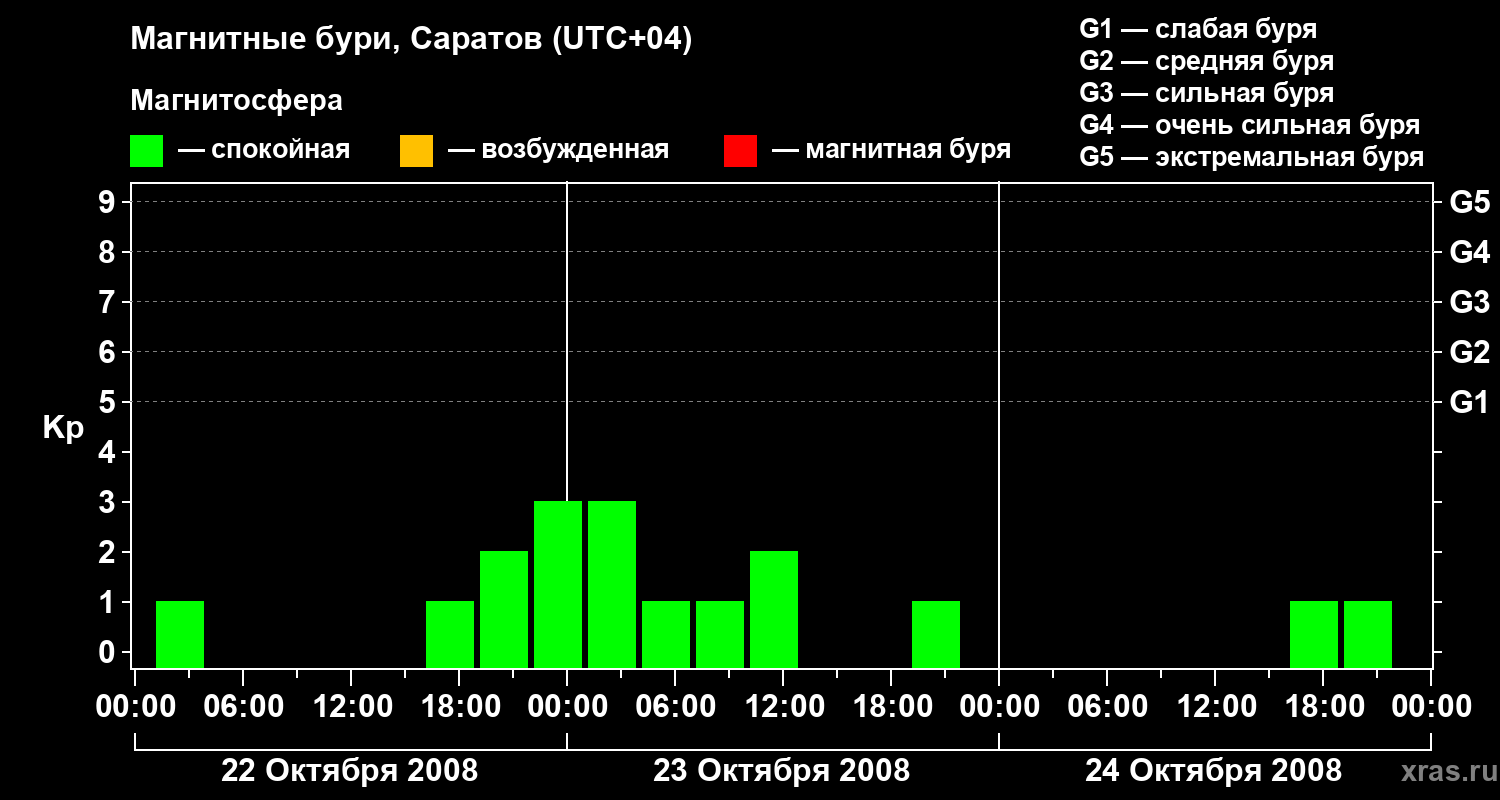 Изменения геомагнитного индекса Kp с 22 по 24 октября 2008 года для средних широт
