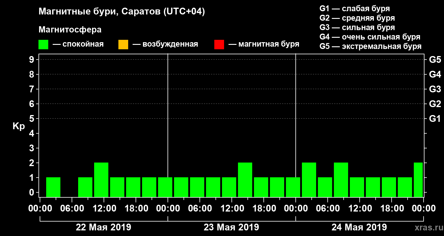 Изменения геомагнитного индекса Kp с 22 по 24 мая 2019 года для средних широт