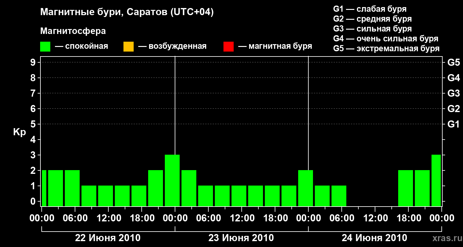 Изменения геомагнитного индекса Kp с 22 по 24 июня 2010 года для средних широт