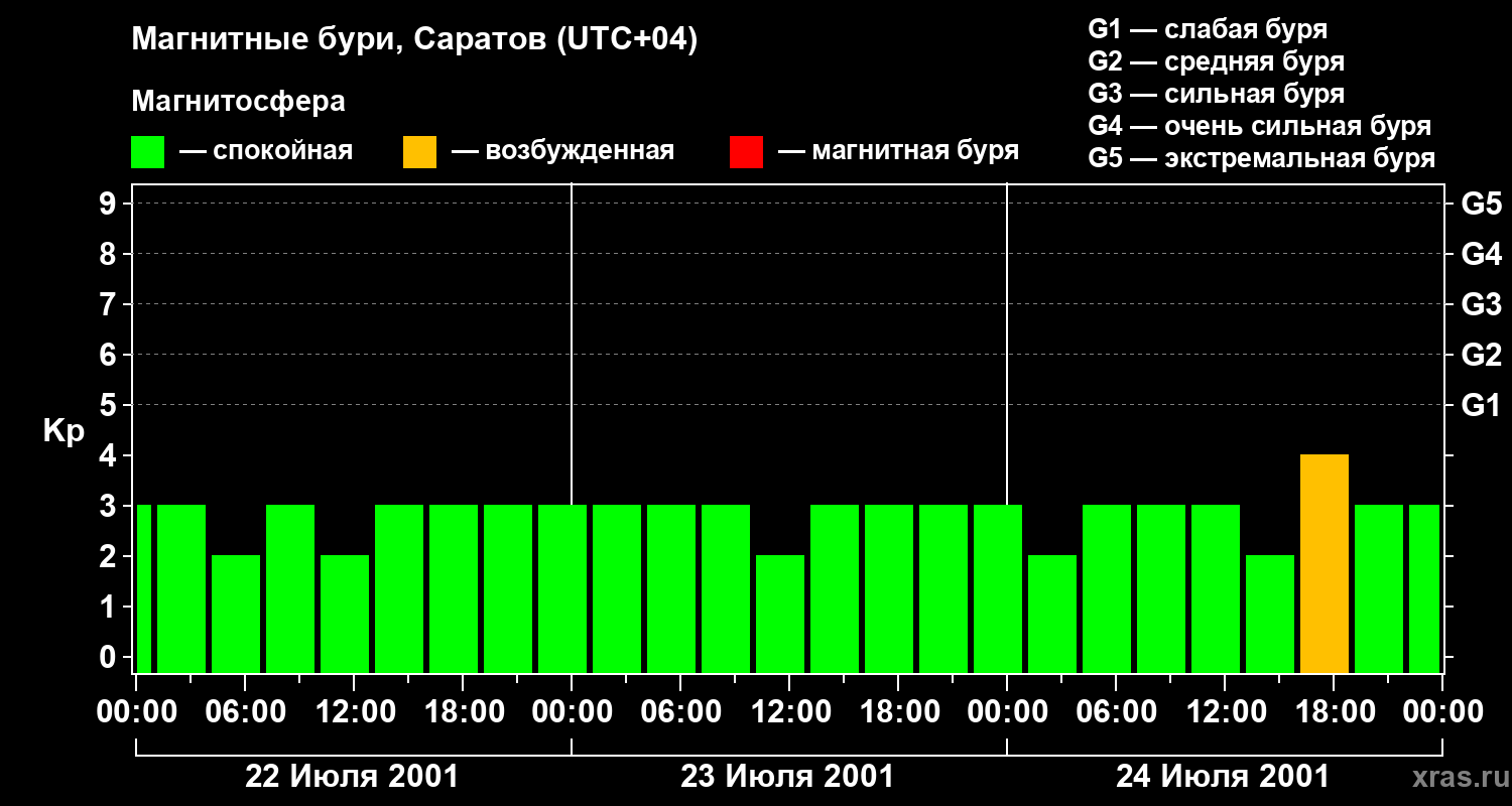 Изменения геомагнитного индекса Kp с 22 по 24 июля 2001 года для средних широт