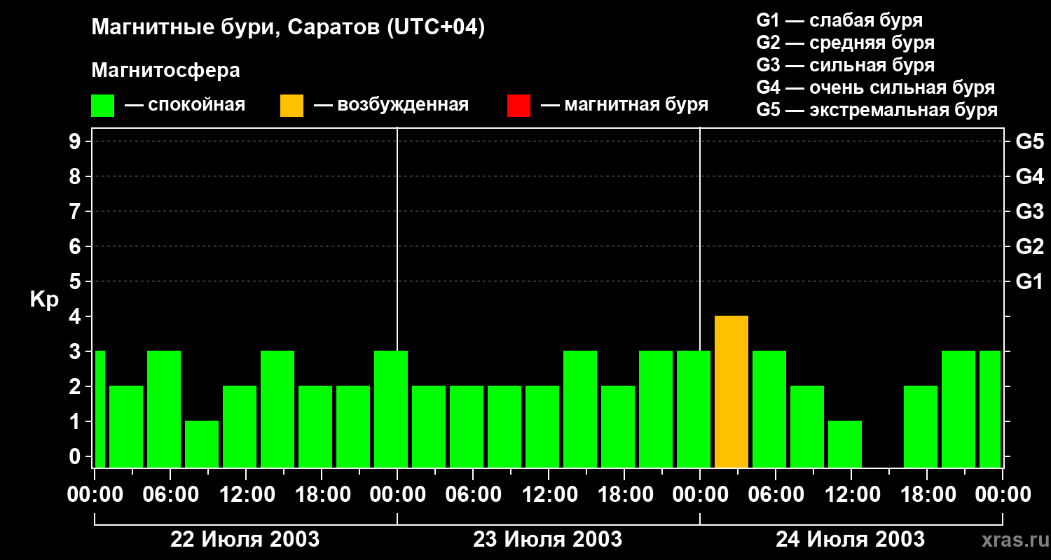 Изменения геомагнитного индекса Kp с 22 по 24 июля 2003 года для средних широт