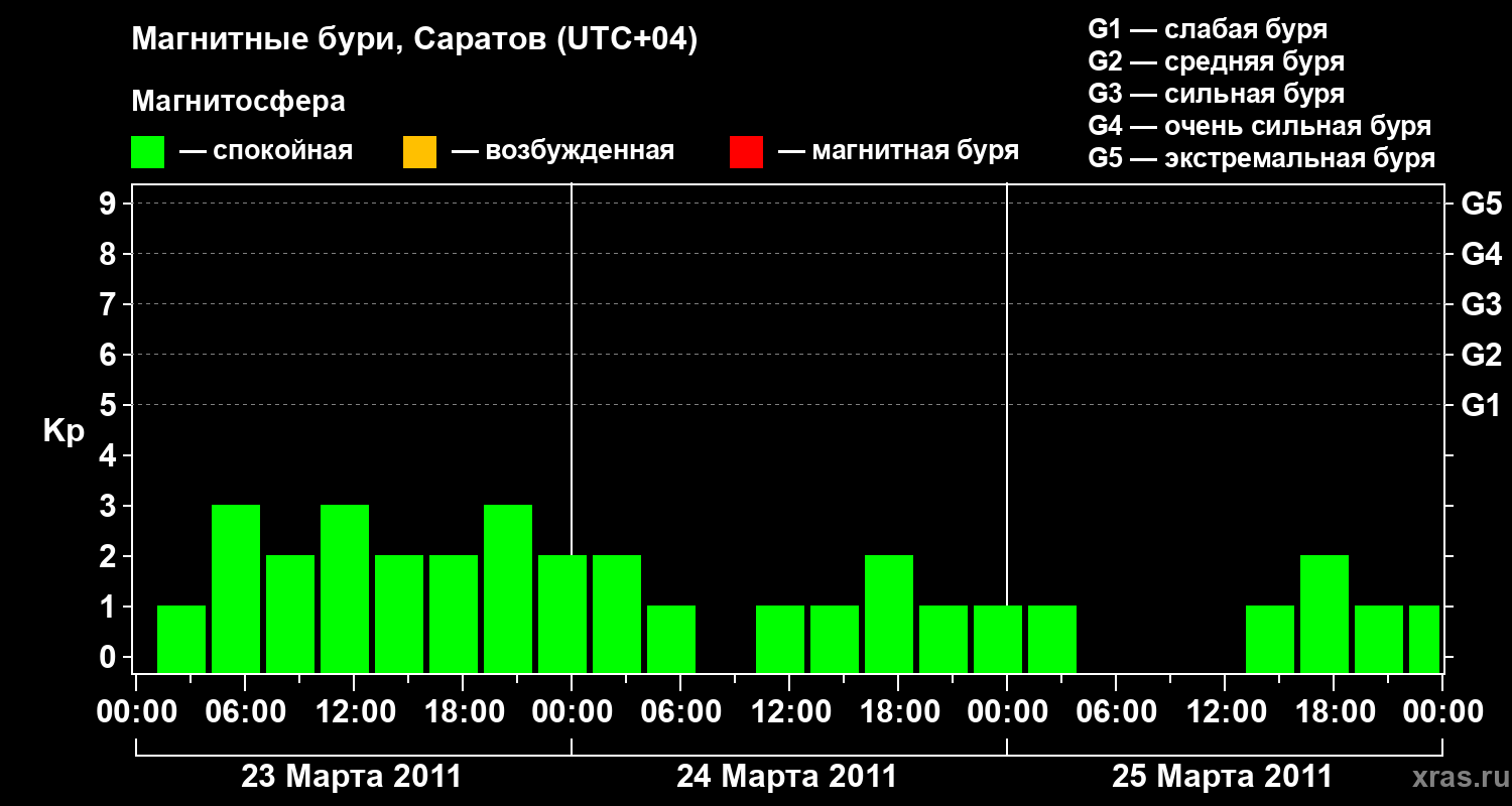 Изменения геомагнитного индекса Kp с 23 по 25 марта 2011 года для средних широт