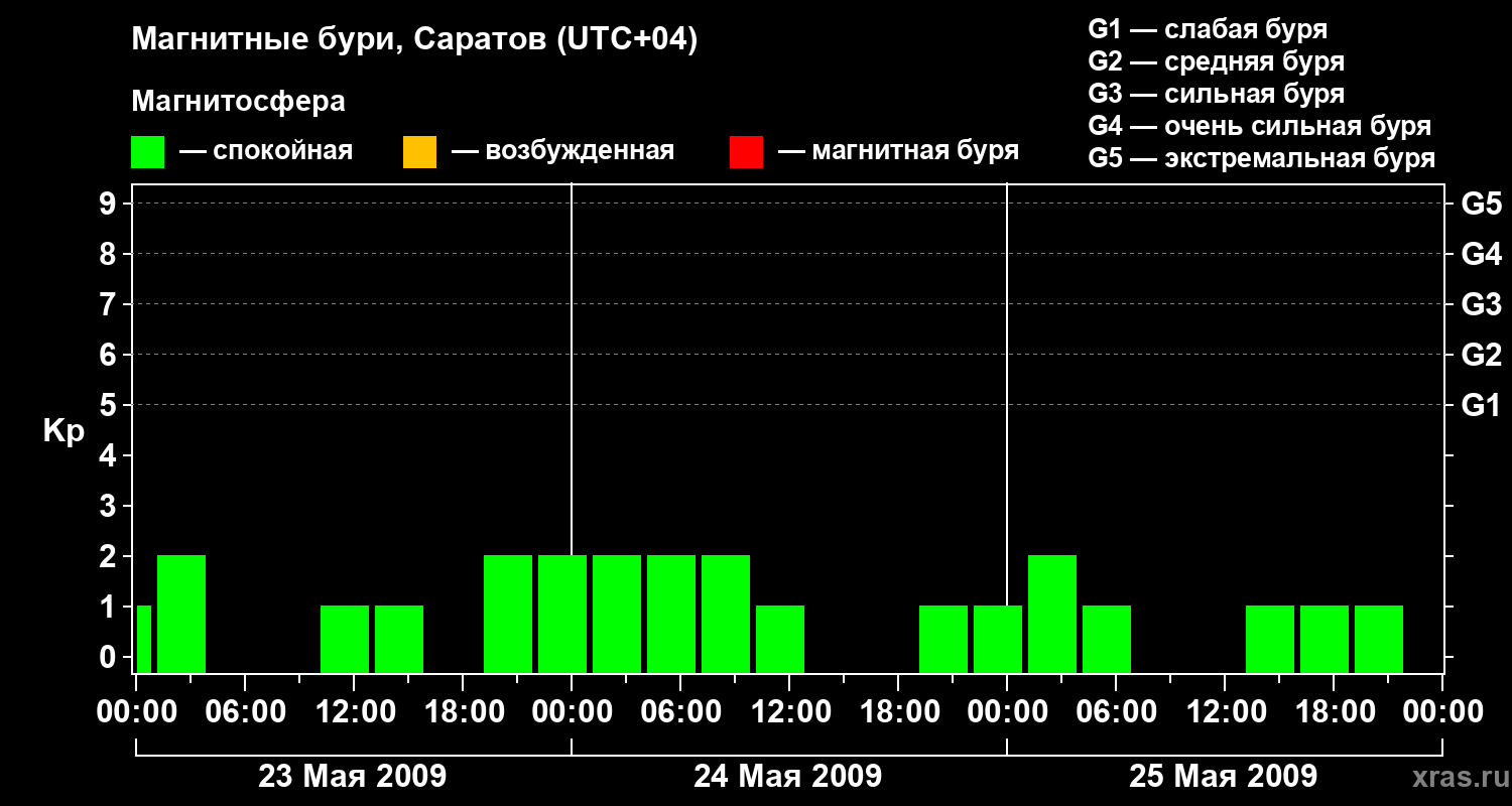 Изменения геомагнитного индекса Kp с 23 по 25 мая 2009 года для средних широт