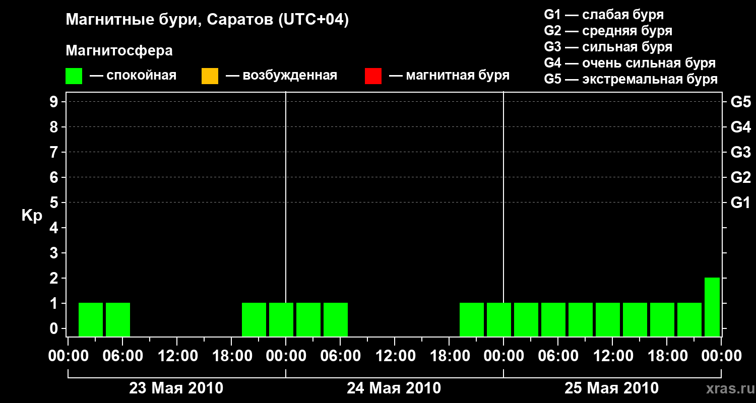 Изменения геомагнитного индекса Kp с 23 по 25 мая 2010 года для средних широт
