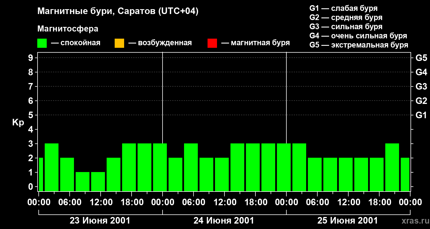 Изменения геомагнитного индекса Kp с 23 по 25 июня 2001 года для средних широт