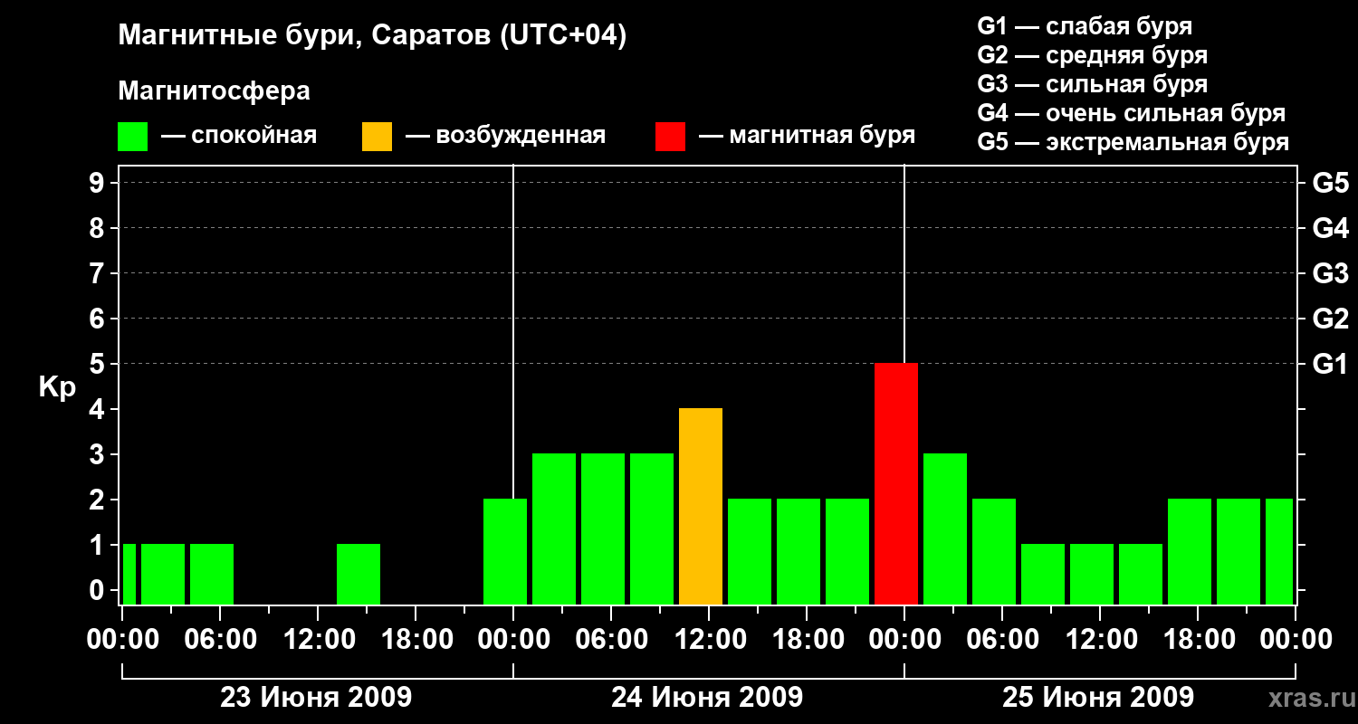 Изменения геомагнитного индекса Kp с 23 по 25 июня 2009 года для средних широт