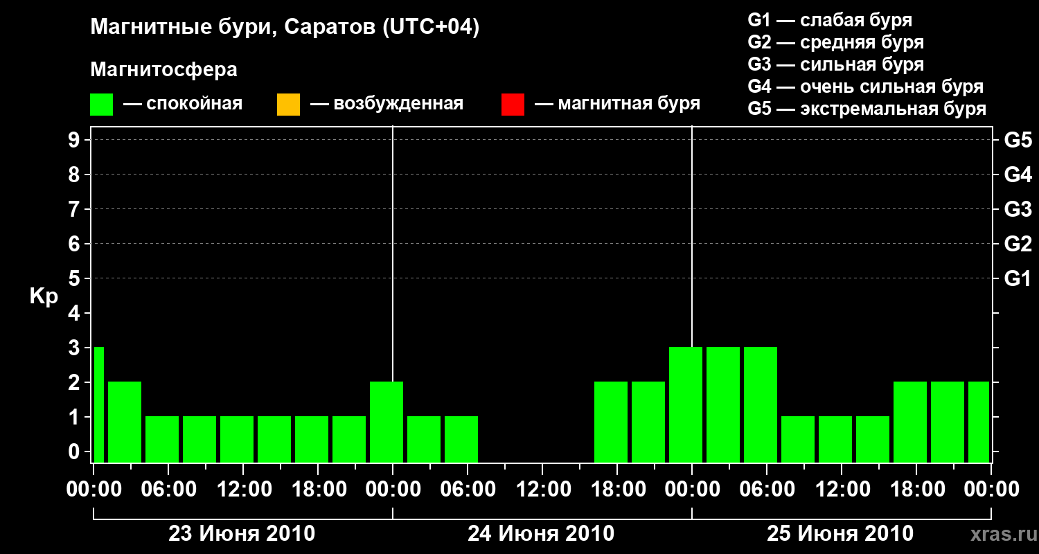 Изменения геомагнитного индекса Kp с 23 по 25 июня 2010 года для средних широт